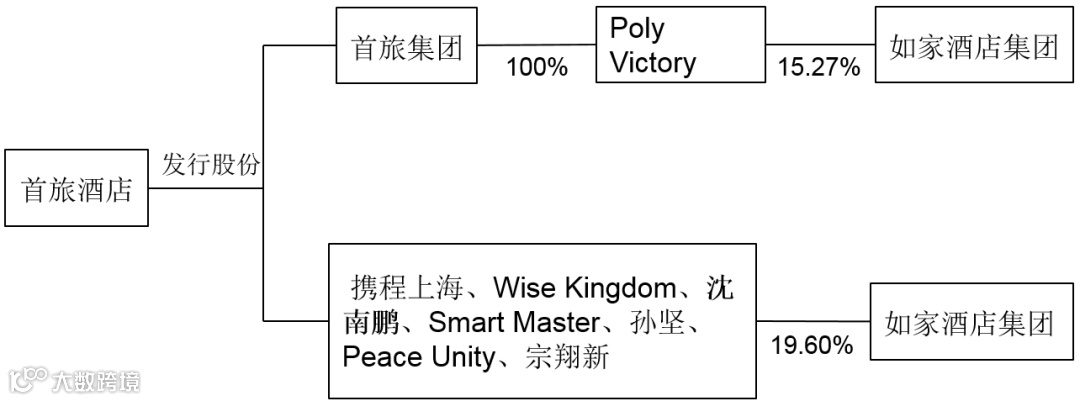 首旅酒店通过向首旅集团发行股份收购PolyVictory100%股权,从而间接持有如家酒店集团15.27%股权;同时,通过向携程上海、Wise Kingdom、沈南鹏、Smart Master、孙坚、Peace Unity、宗翔新发行股份收购如家酒店集团19.60%股权。至此,首旅酒店通过发行股份的方式收购了如家酒店集团34.87%股权。