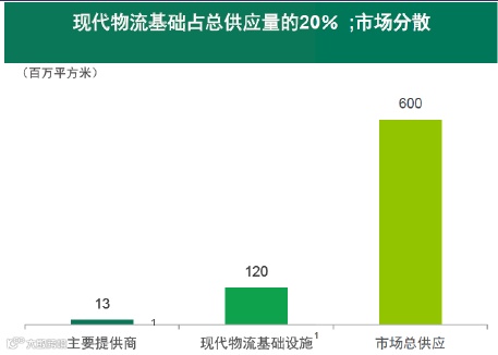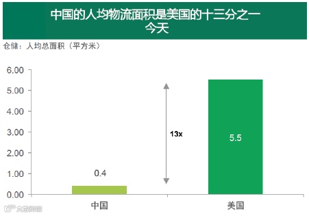 需求端,中国日益增长的制造业进出口、零售及电商业务、相关第三方物流产业的巨大规模产生的物流需求与严重不足的社会物流供给相矛盾。目前,我国的人均物流面积为0.4平方米,与美国的5.5平方米仍有约13倍的差距。
