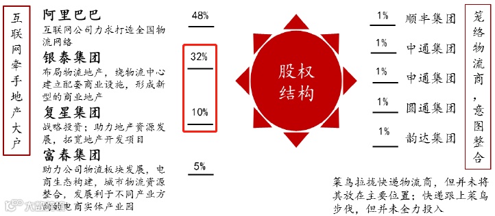 菜鸟网络成立于2013年5月28日,注册资本50亿元。成立之初,创始股东包括:阿里巴巴集团、银泰集团、复星集团、富春控股、顺丰集团、三通一达、宅急送等。该股权折射菜鸟的本质:整合上下游合作伙伴+进军物流地产。