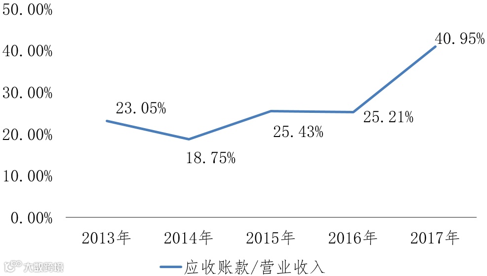 金一文化的应收账款/营业收入的比例不断攀升,尤其是在2017年。2017年,金一文化的营业收入同比增加约43亿元,应收账款同比增加约35亿元,换言之,金一文化2017年营业收入的增加极大依赖应收账款的增加。