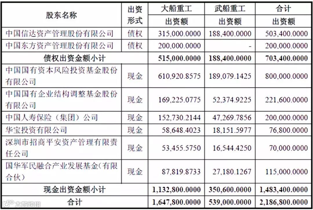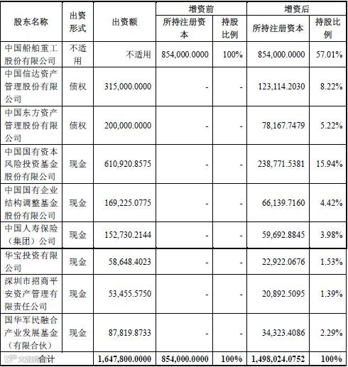中国国有资本风险投资基金股份有限公司(以下简称“国有资本基金”)、中国国有企业结构调整基金股份有限公司(以下简称“结构调整基金”)、中国人寿保险(集团)公司(以下简称“中国人寿”)、华宝投资有限公司(以下简称“华宝投资”)、深圳市招商平安资产管理有限责任公司(以下简称“招商平安”)、国华军民融合产业发展基金(有限合伙)(以下简称“国华基金”)分别与中国重工签署《投资协议》,约定分别以现金对标的公司进行增资,投资金额合计1,483,400万元,标的公司所获现金增资用于偿还债务(上述八家投资机构合称“投资人”)。
