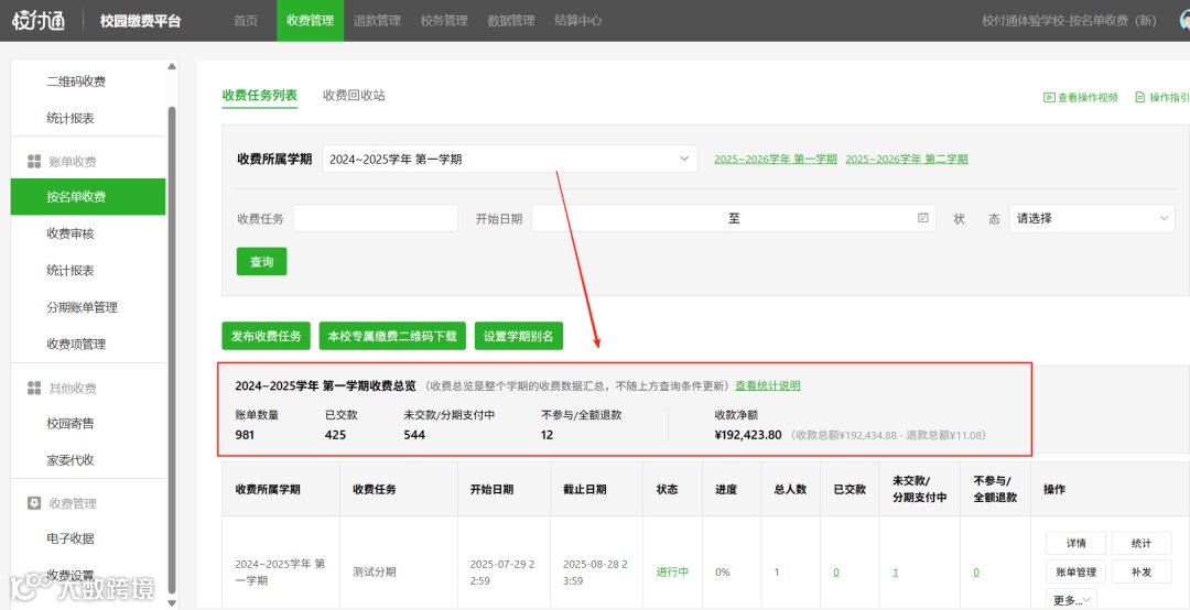 为进一步凸显学期管理在收费工作中的优势,当选定单个学期查询收费数据时,系统会自动汇总并展示该学期的整体收费情况。这便于学校及时掌握该学期的收费进度,为后续收费工作的跟进提供关键数据支持。