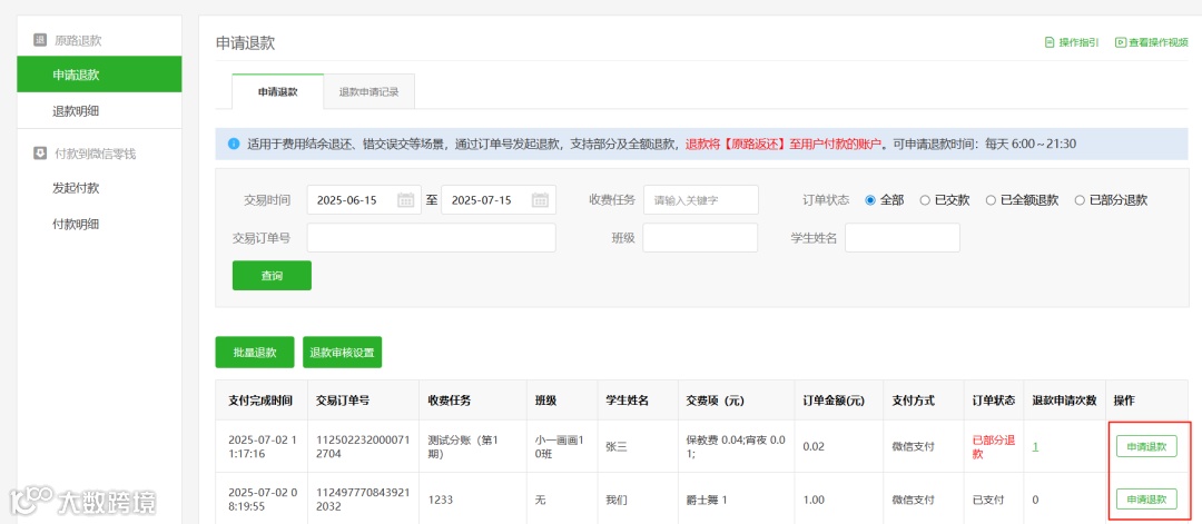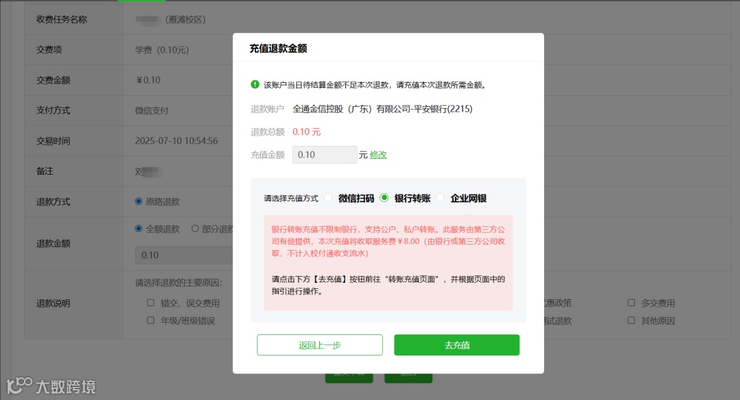 操作路径:退款管理-申请退款-充值退款金额-银行转账