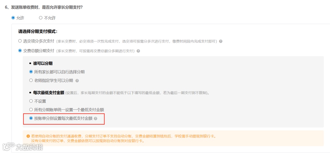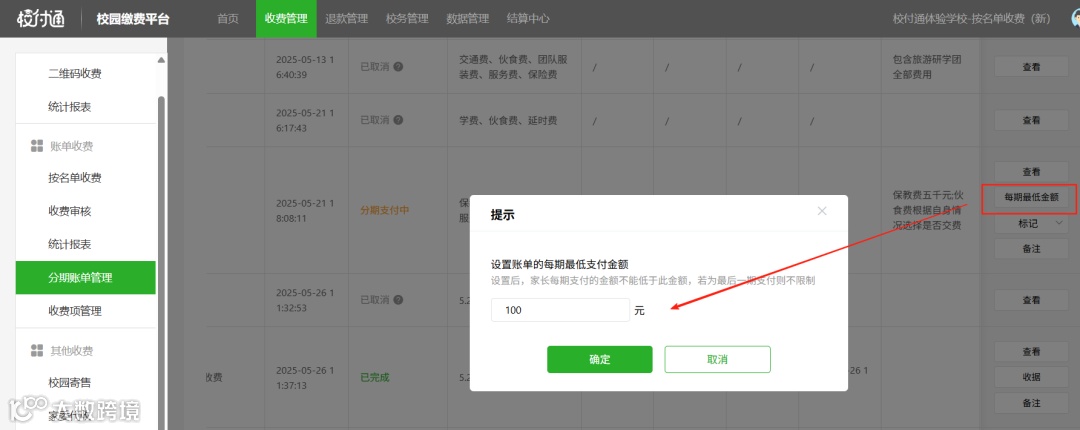 鉴于账单收费中不同学生收费标准存在差异,为更好地发挥分期支付功能的优势,分期支付统一设置最低支付金额扩展为支持按账单设置最低支付金额。这种更灵活的分期支付方式,能应对更复杂的收费场景,有助于提高家长的支付积极性,同时加强学校的收费管理。