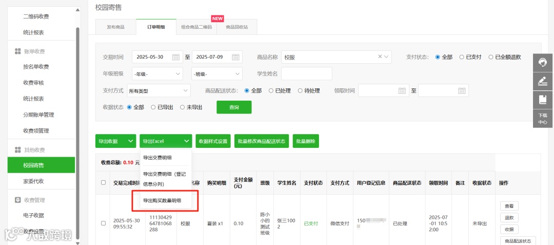 操作路径:收费管理-校园寄售-订单明细-导出Excel-导出购买数量明细