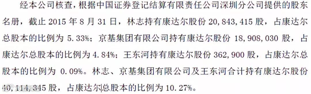 2015年9月7日,康达尔公告,公司9月1日接到京基与林志、王东河送达的权益变动书:三者分别持有康达尔股票4.84%、19.80%(林志账户组)、0.09%,合计达24.74%,即9,660万余股,已逼近合计持股31.66%的第一大股东华超投资及其一致行动人。