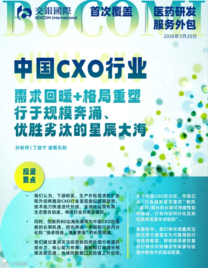 本文节选自交银国际已发布研究报告《中国CXO:需求回暖+格局重塑,行于规模奔涌、优胜劣汰的星辰大海(2026/03/20)。
