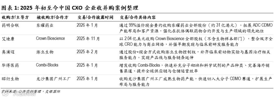 从实践层面看,2025年以来,行业的并购及合作动态正逐步印证上述趋势。重点案例包括:1)药明合联通过收购东曜药业快速获取ADC商业化产能,强化了交付能力与规模壁垒;2)奥浦迈并购澎立生物,实现了从培养基、CDMO向临床前CRO的纵向延伸,加速构建全链条服务体系;3)艾迪康通过收购海外CRO 公司Crown Bioscience,增强其临床前肿瘤药研平台。