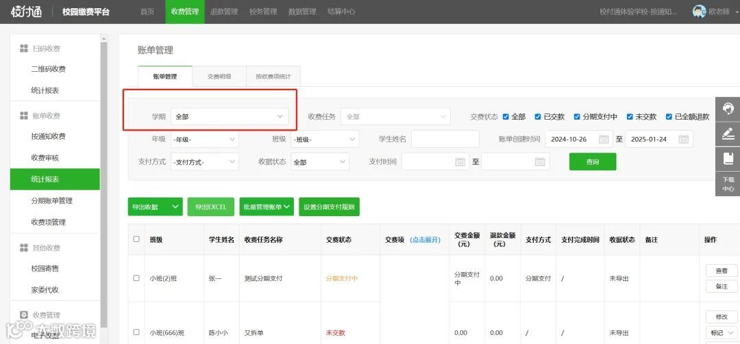 进入统计报表页面,默认显示近三个月全部学期的统计数据。若需要查询更长时间段的数据,需筛选单个学期或单个收费任务。