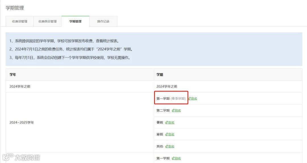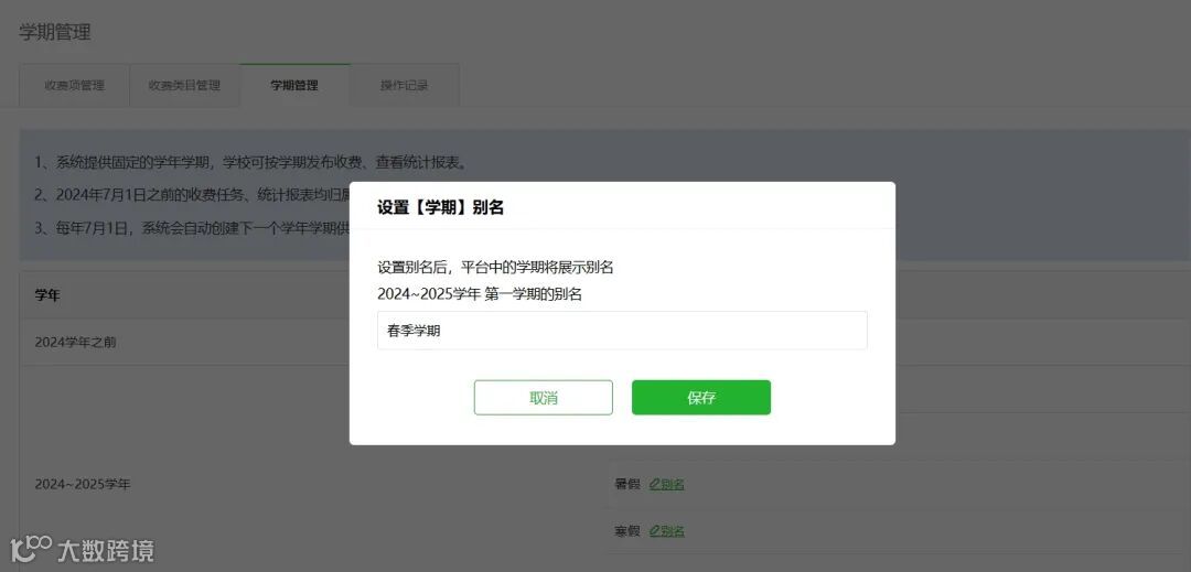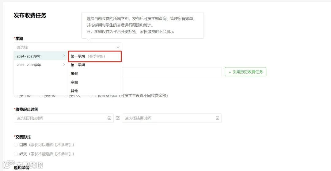 现有系统提供的学期名称不能完全满足所有学校实际的学期使用习惯,学期可自行设置别名,设置后,发布/修改收费任务时将展示学期别名,更贴合学校的学期管理需求。