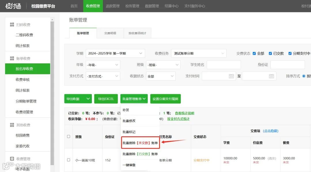 操作路径:收费管理-按通知收费/按名单收费-账单管理-批量管理账单