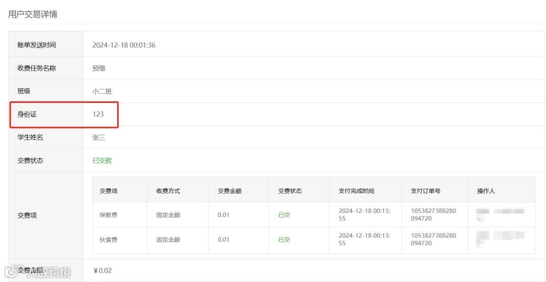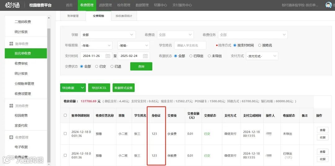 为提高对同名学生账单查询的准确性,按名单收费的交费明细新增展示缴费编号,便于学校通过学生姓名+唯一编号快速准确定位目标学生账单信息。