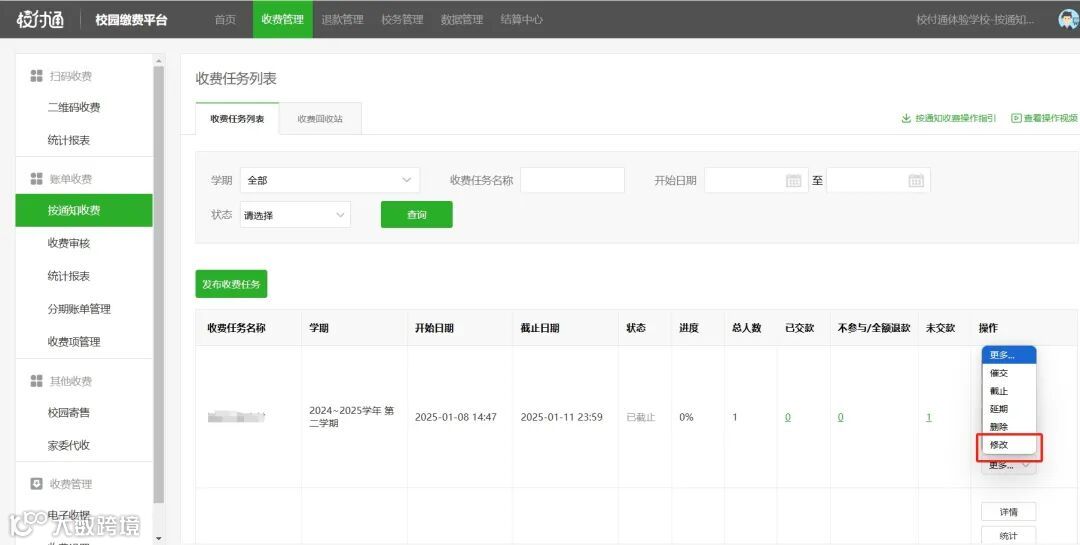 操作路径:收费管理-按通知收费/按名单收费-修改