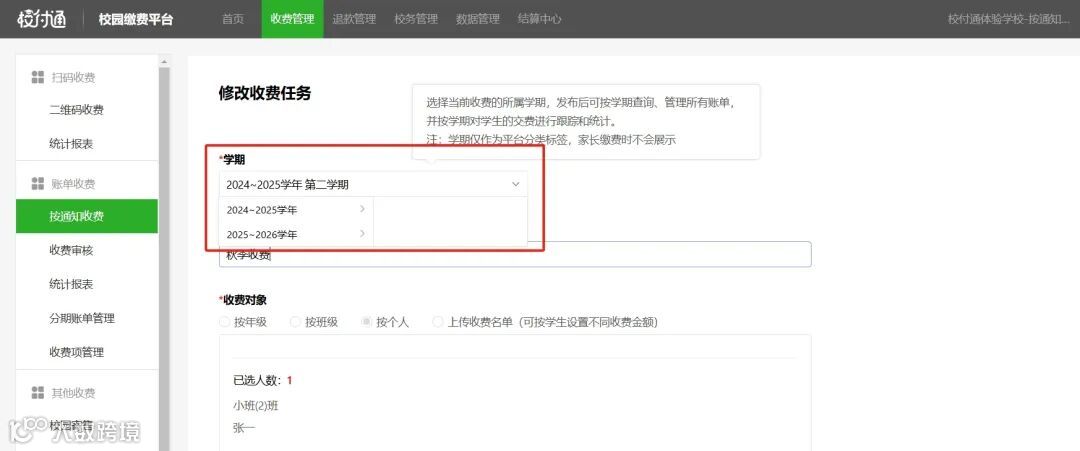 为解决学校发布收费时错选学期而不支持修改情况,学期管理再度升级优化!收费任务支持修改学期,更好提高收费效率。