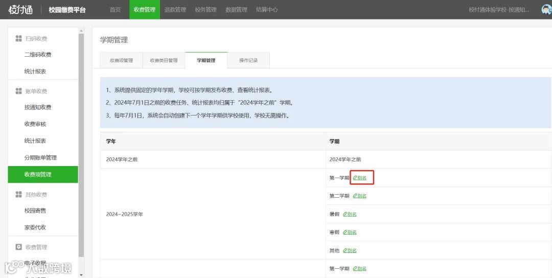 操作路径:收费管理-账单管理-收费项管理-学期管理