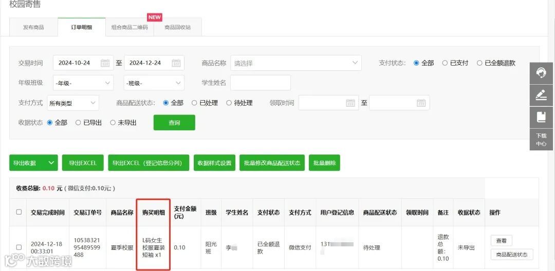 操作路径:收费管理-校园寄售-订单明细