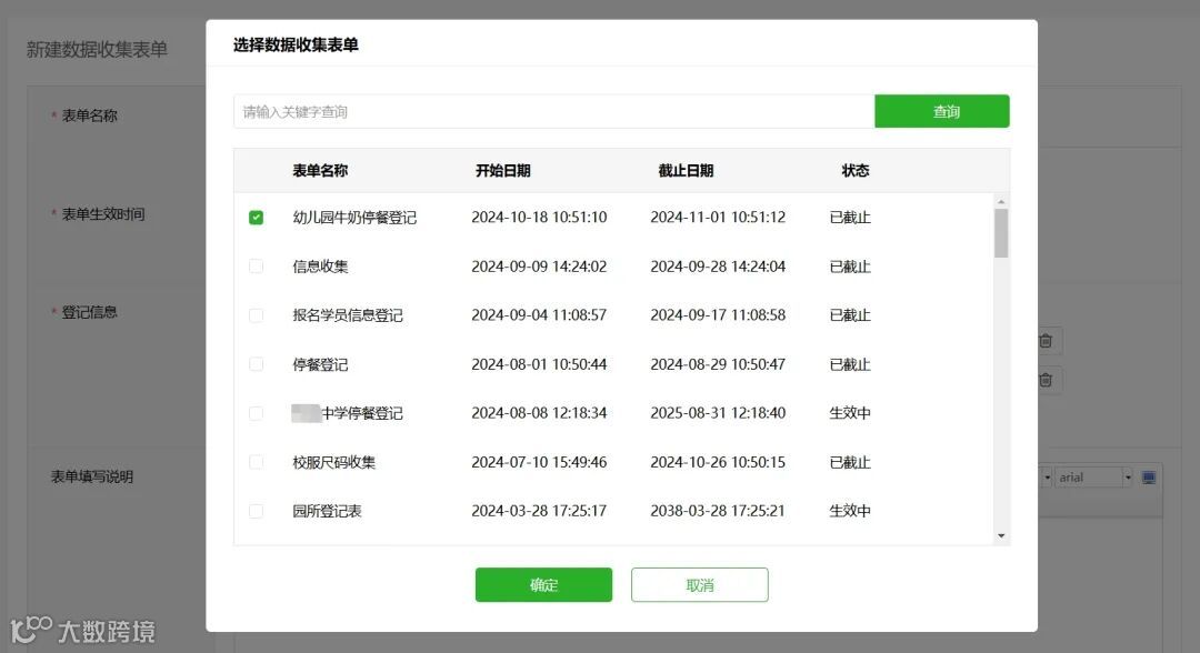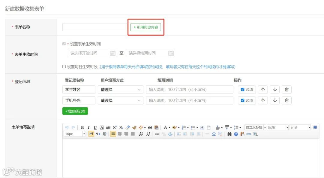 发布新数据收集表单时,可直接引用历史发布内容。勾选历史表单,系统自动填充历史表单内容,提高发布数据收集表单的工作效率。