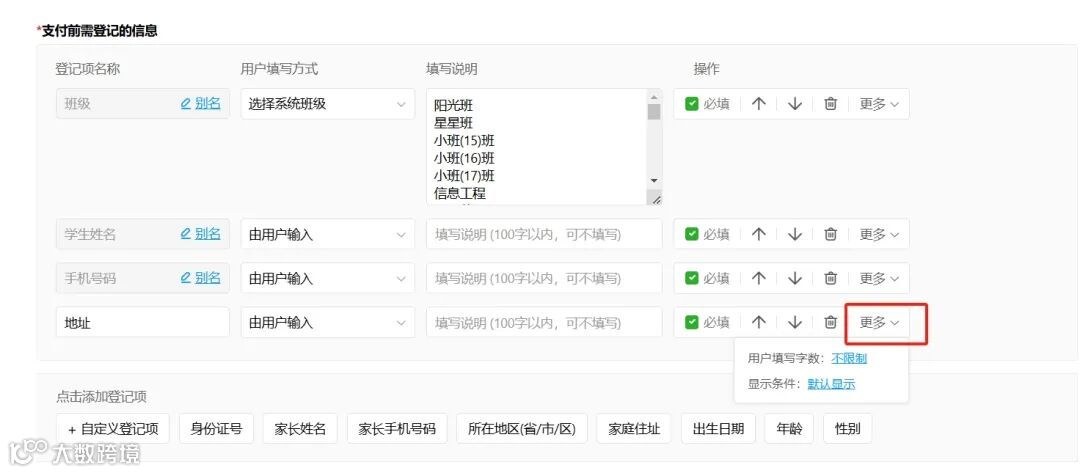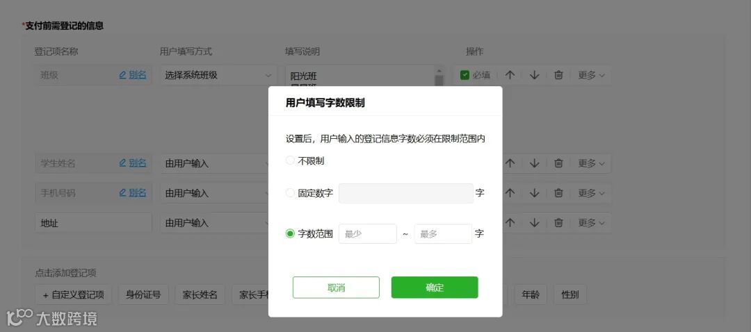 二维码收费的支付前登记项信息新增可设置字数填写范围,进一步规范家长填写标准,便于老师后续对填写内容进行整理统计。