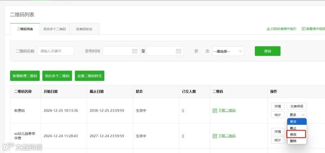 操作路径:收费管理-扫码收费-二维码收费-修改