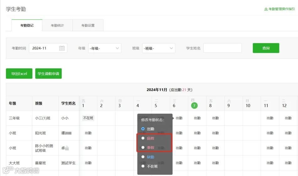 为满足学校细分考勤状态需求,考勤状态中的【请假】优化细分为【事假】和【病假】,学校可根据学生请假实际情况进一步细分选择状态。