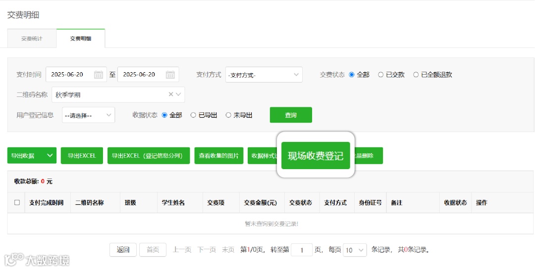 即便家长在现场使用现金或转账等线下支付,学校工作人员也能在校付通后台的现场收费登记中快速录入支付信息,系统自动生成对账报表,告别手工统计的繁琐,显著提高收费效率。