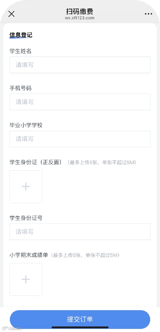 校付通扫码收费同时支持强大的信息收集功能,学校可自行设置学生基础信息:如姓名、联系方式、户籍地址等,还能要求家长上传成绩单、体检表、户口本照片等入学必备图片资料。