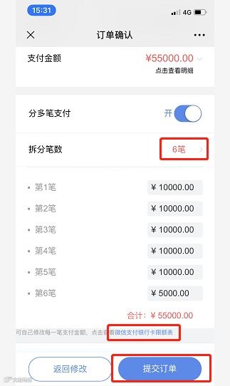 拆分后的每个子订单,可以选择不同的银行卡(储蓄卡/信用卡)来支付;