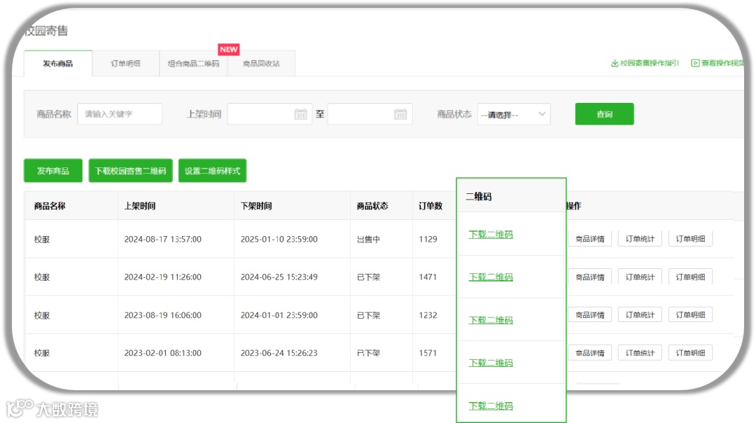 学校自行上架校服商品,家长可在家长端进入校园寄售或是通过学校分享的商品二维码自行选购。