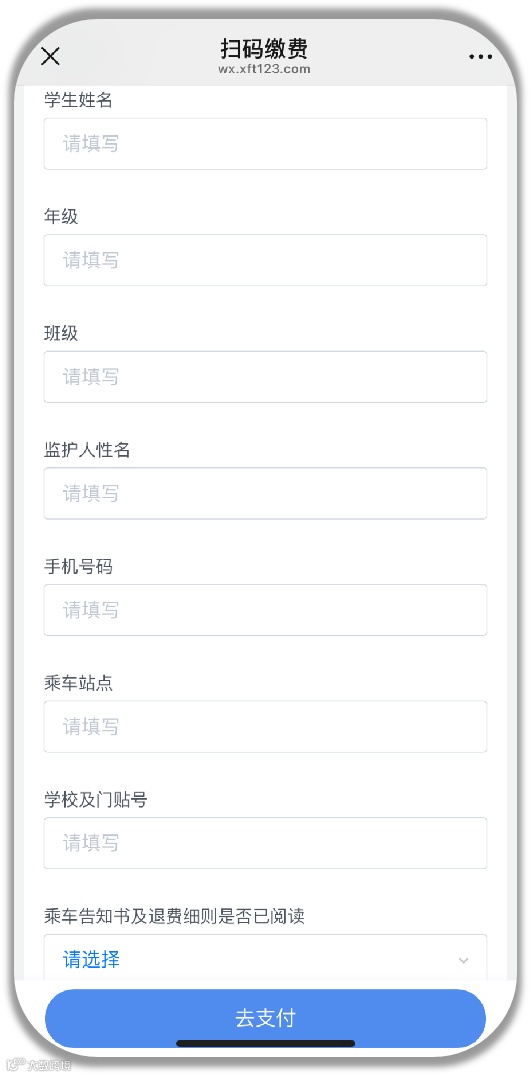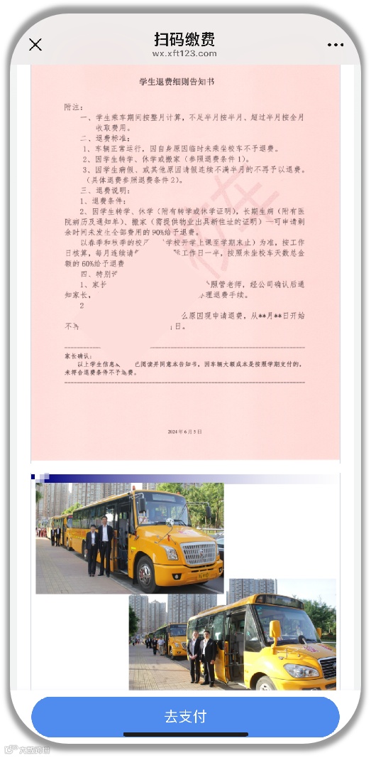 校车公司发布的扫码收费项目会上传对应《乘坐校车告知书》、《退费细则告知书》等重要说明内容,便于家长在支付前阅读。