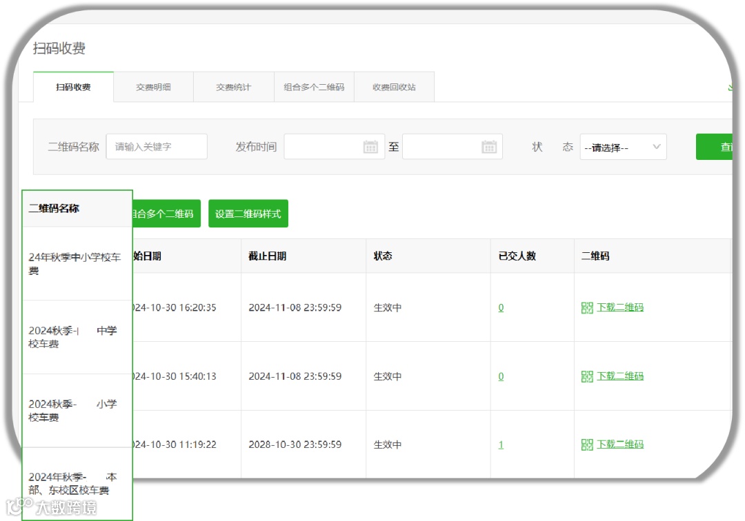 校车公司每年开学季都会根据学校/项目创建对应的收费二维码,校车负责人可查看、下载对应的交费明细,整理后可提供对应的校车服务。