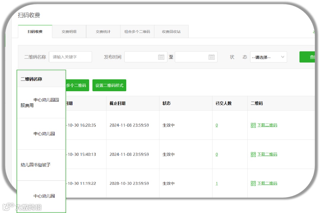 商行服务多个幼儿园,同时收取校服费用,通过扫码收费对每一个幼儿园创建独立的收费二维码,方便统计购买数据。