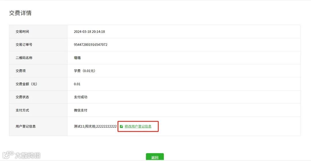 新增教师可修改用户登记信息入口。老师可在交费明细中,对家长缴费时填写错误的登记信息进行修改。