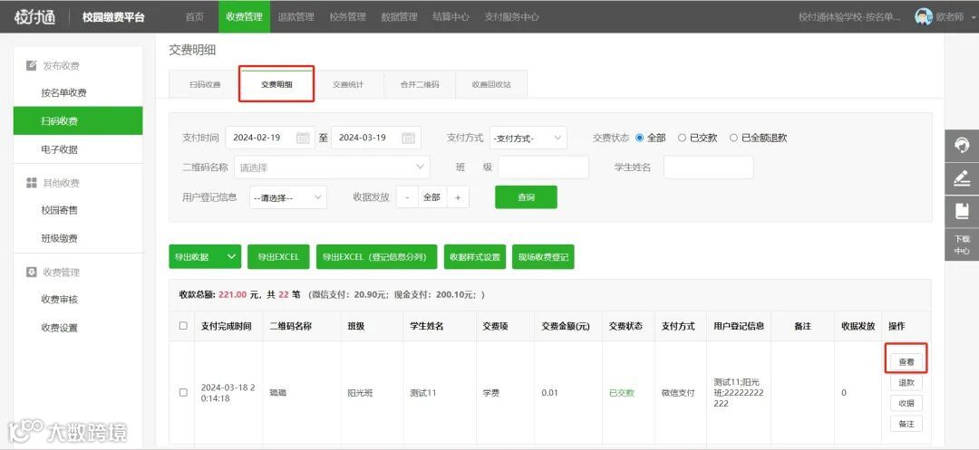 操作路径:收费管理-扫码收费-交费明细-查看
