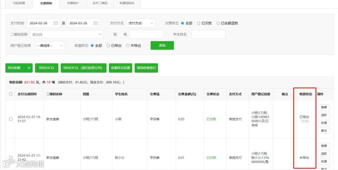 操作路径:收费管理-按通知/按名单收费-账单管理/扫码收费-交费明细