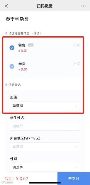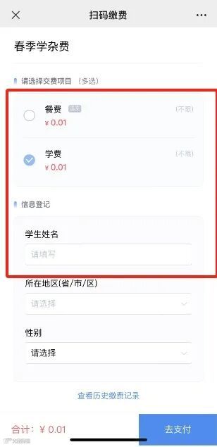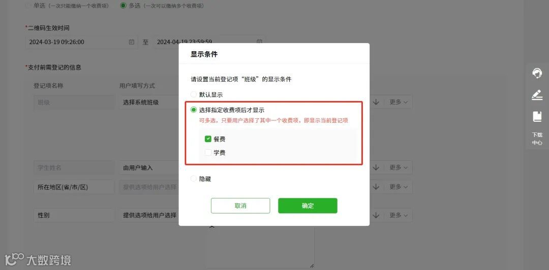 发布收费时,可设置支付前需登记的信息的显示条件,家长选择了指定的收费项进行缴费,对应的登记项才显示,便于老师的收费项目分类信息收集。