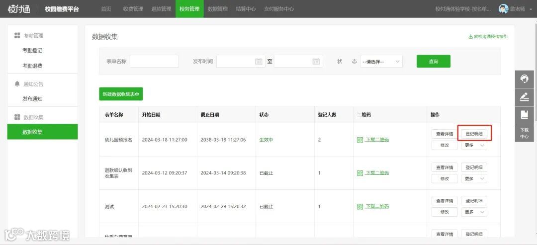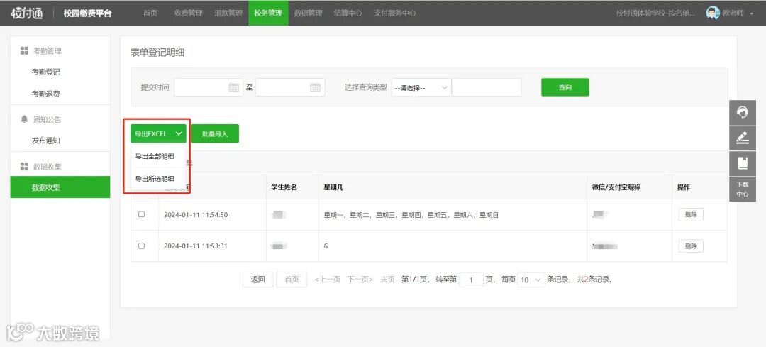 本次校付通平台更新内容包括:数据收集的登记明细导出EXCEL新增导出样式。