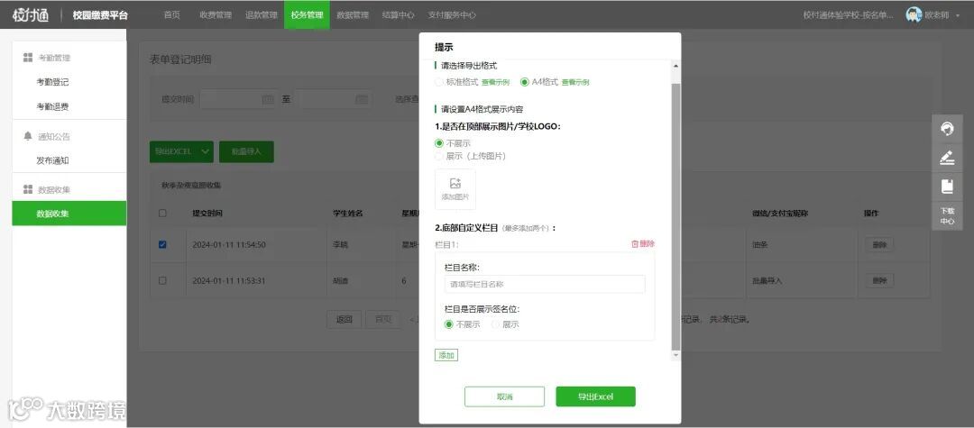 校务管理中的数据收集功能的登记明细新增导出A4格式。导出前,可对A4格式展示内容进行自定义设置,学生登记完成提交后,学校可对登记明细进行打印、核对签字以及进行其他后续的线下流程。