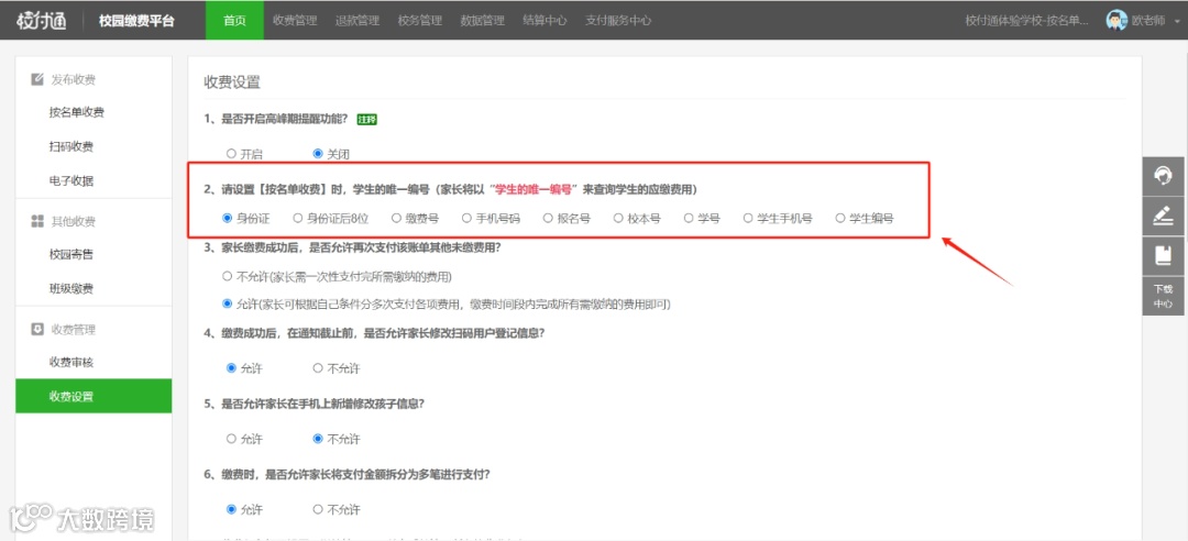 在收费管理-收费设置中可以选择本校查询账单的唯一编号,设置后需提前告知家长,便于家长缴费时输入正确的唯一编号查询缴费