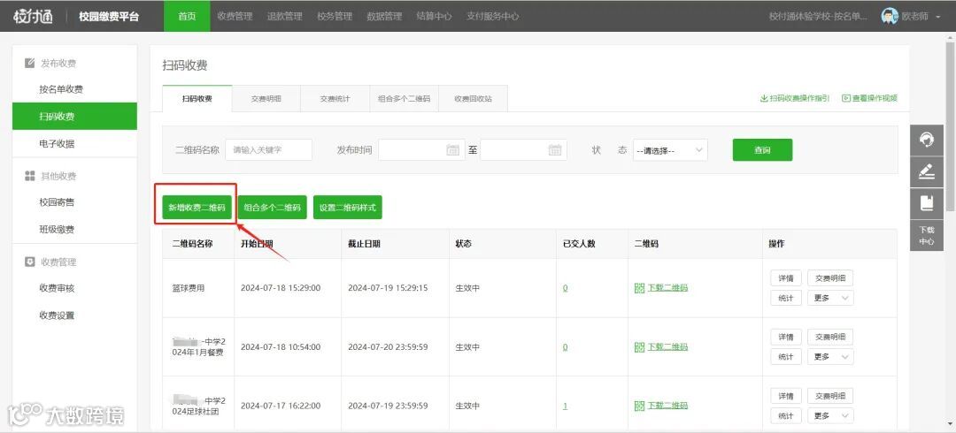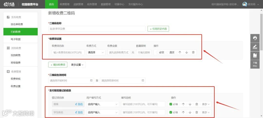 在收费管理-扫码收费选择新增收费二维码,设置收费项目以及收费金额,根据学校收集信息需求设置登记项信息,完善其他收费信息即可直接发布