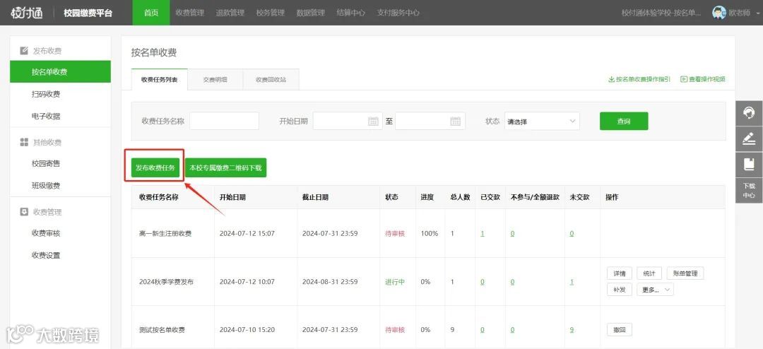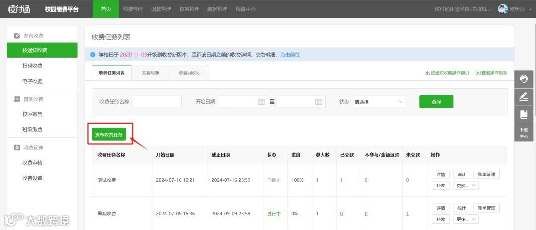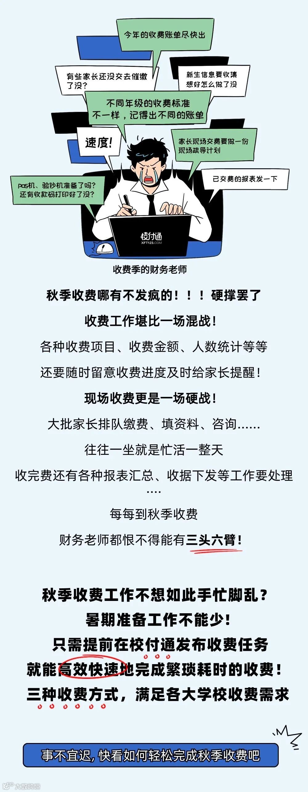 1️⃣秋季收费工作繁杂,建议老师们提前登入平台熟悉发布操作,避免在收费期因不熟悉操作延误收费进度,若在操作过程中有任何疑问,请及时联系专属客户经理或校付通客服!