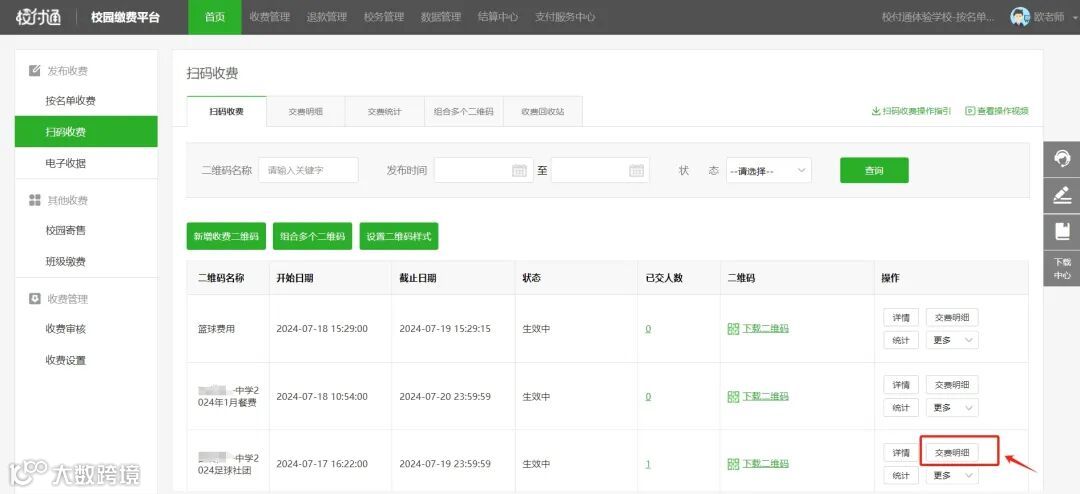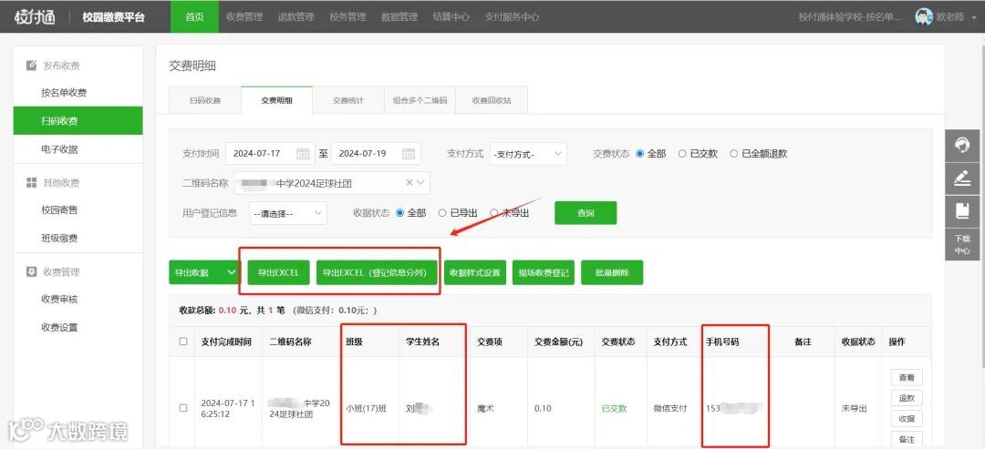 完成收费后,可在交费明细中下载、导出用户登记信息,便于后续对信息进行汇总整理