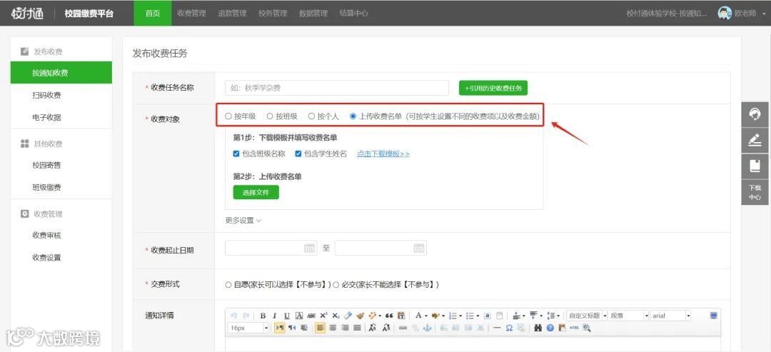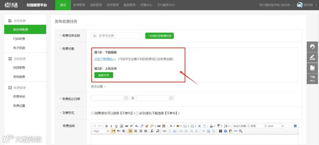 在收费管理-按名单收费选择发布收费,下载模板填写收费项目以及输入学生的收费金额,可为每个学生设置个性化的收费账单,完善其余收费信息即可发布