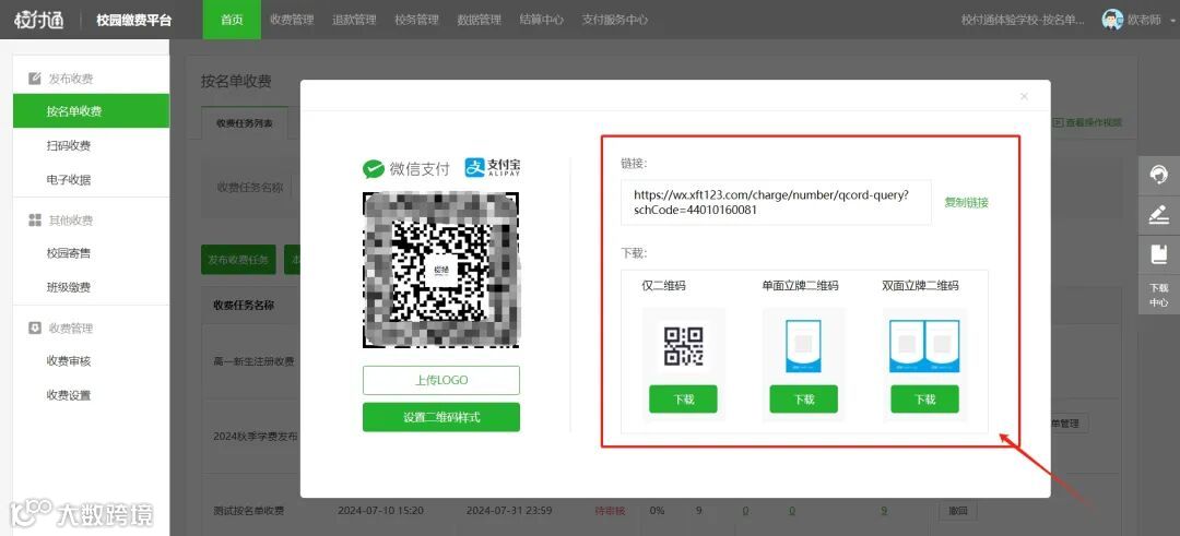 收费任务发布后,下载学校专属二维码。可将学校码嵌入学校公众号或下载、打印,家长扫码后直接输入学生姓名和唯一编号即可查询并缴费