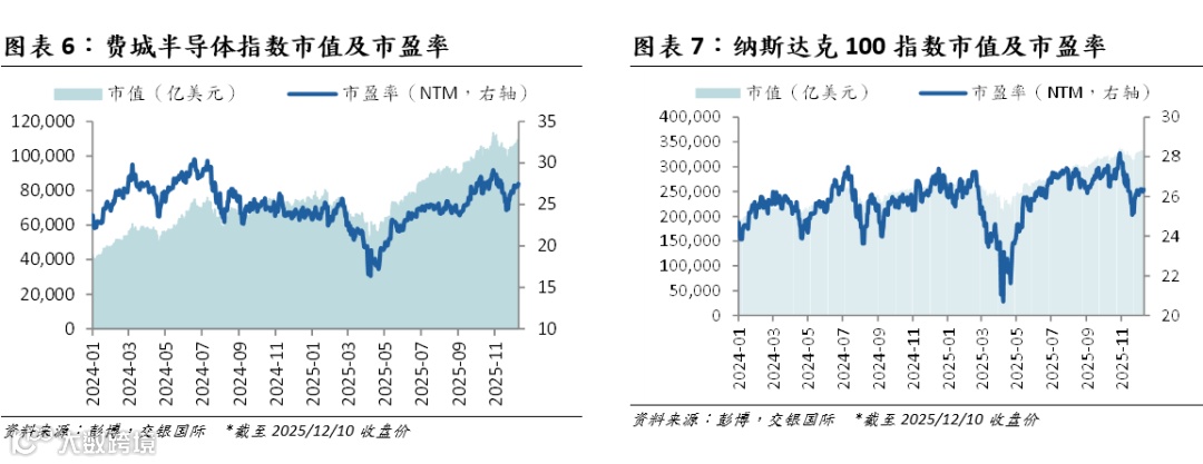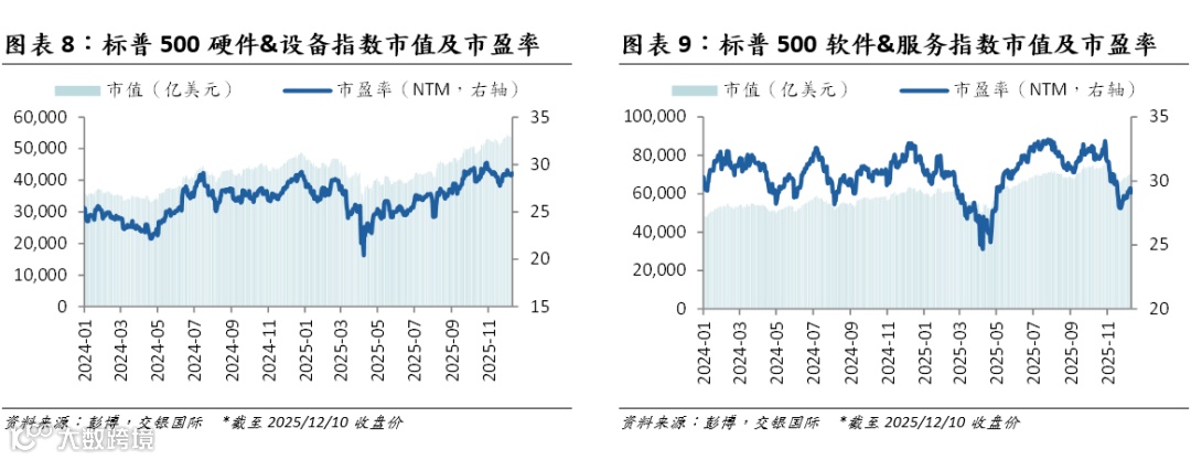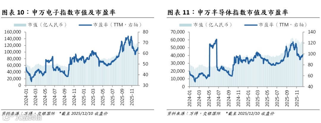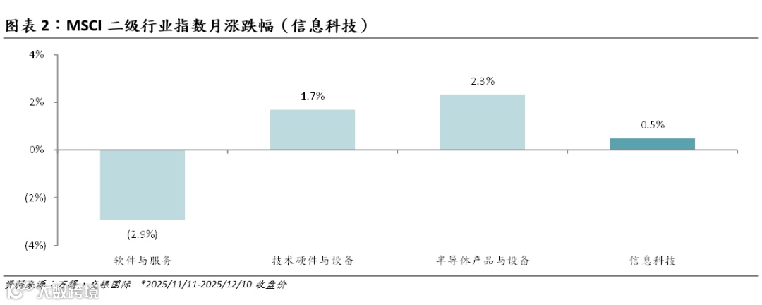 最近一个月,全球科技指数表现呈现分化。统计11月11日至12月10日,MSCI信息科技指数涨0.5%,小幅跑赢MSCI全球指数(+0.3%)。A股Wind信息技术指数逆势涨2.8%,成为同期全行业指数中唯一实现正收益的板块,而沪深300同期则录得1.3%的跌幅。摩尔线程上市后市场反应积极。港股市场或受外部波动影响,恒生指数跌4.3%;恒生科技指数跌5.8%,跌幅仅次于以大型互联网企业为核心成分的恒生传媒指数。估值方面,美股科技股估值在11月下旬普遍下跌后有所反弹,我们认为这一波动或主要来自美联储降息预期的不确定性以及对AI泡沫的市场讨论。A股申万电子/申万半导体指数市盈率均有所回升。