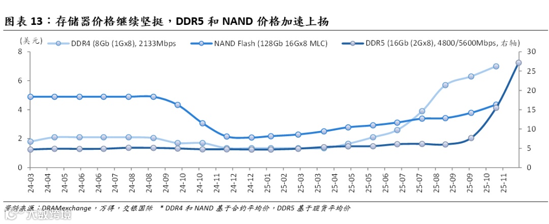 根据DRAMexchange,DDR5(16Gb)现货平均价格已从9月底的7.676美元升至11月底的27.167美元;DDR4(8Gb)和NAND(128Gb MLC)的合约平均价格也在10月继续环比上涨11%和15%。本轮存储器上行周期价格上涨幅度和时长均超我们预期。我们认为HBM存储芯片供应紧张的态势或将在2026年有所缓解,但总体存储器价格或将在2026全年保持坚挺。