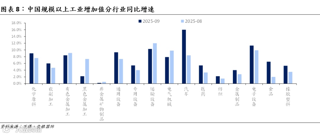 前三季度规模以上工业增加值同比增长6.2%,其中9月同比增长6.5%,增速较上月大幅加快1.3个百分点,并超出市场预期的5.0%。工业生产强劲源于出口改善的拉动,9月规模以上工业企业出口交货值由降转增,同比增长3.8%,其中专用设备、通用设备等行业出口增速显著加快。从结构看,制造业增长6.8%,装备制造业和高技术制造业前三季度分别增长9.7%和9.6%,增速显著快于全部工业,制造业向高端化智能化转型的趋势持续深化。新兴产品产量快速增长,工业机器人、服务机器人、3D打印设备产量分别增长29.8%、16.3%、40.5%,新能源汽车产量增长29.7%,反映新质生产力正加速成长。