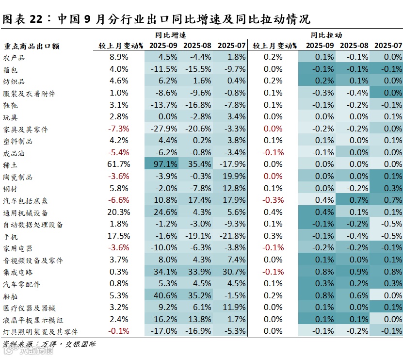 分产品来看,高技术产品出口继续保持较快增长势头,机电产品出口增长9.6%,占出口总额比重高达60.5%,其中集成电路出口额连续三个月同比增速维持在30%以上。“新三样”产品出口保持两位数增长,但9月部分产品产量受“反内卷”政策影响有所回落,其中太阳能电池产量首次下降,新能源汽车产量增速放缓。