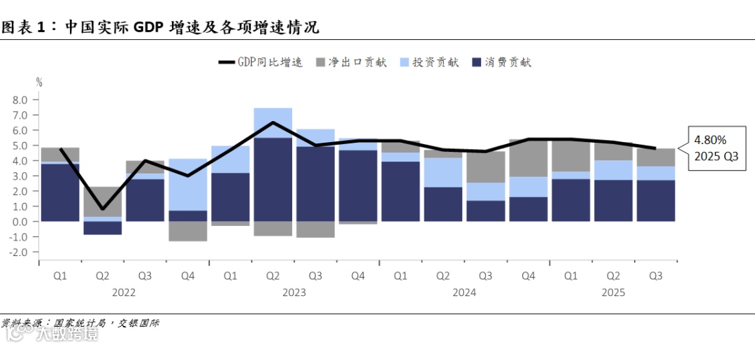 2025年前三季度,中国经济展现出较强韧性。前三季度GDP同比增长5.2%,其中3季度增长4.8%,整体仍运行在合理区间。环比来看,3季度GDP环比增长1.1%,与2季度持平,增速变化主要源于:1)国际层面,关税情况波动下,全球经贸关系以及国际贸易增长面临不确定性;2)中国经济正处于结构调整关键期,新旧动能接续转换。总体来看,前三季度中国经济在复杂环境中保持总体平稳、稳中有进的发展态势,新旧动能转换持续推进,高质量发展取得积极进展,期待内生动力进一步加强,巩固经济回升向好基础。