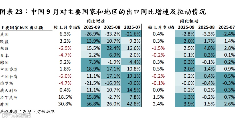 分区域来看,贸易伙伴多元化布局成效明显,前三季度对“一带一路”国家进出口增长6.2%,为应对传统欧美市场波动提供了重要缓冲。9月中国对美国出口同比降26.9%,降幅有所收窄,对欧盟出口增速加快至13.9%,对东盟出口增长15.5%,对非洲、拉美出口分别大幅增长56.8%、15.8%,新兴市场成为出口增长的重要支撑。