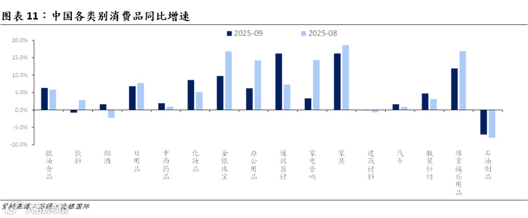 分类别看,9月商品零售和餐饮收入增速均出现回落,分别增长3.3%和0.9%,或与中秋错月有关。消费升级品类表现持续亮眼,前三季度体育娱乐用品类、金银珠宝类商品零售额分别增长19.6%、11.5%。“以旧换新”政策效应持续显现但边际递减,前三季度家用电器和音像器材类、文化办公用品类、通讯器材类、家具类商品零售额分别增长25.3%、19.9%、20.5%、21.3%,但9月部分耐用品增速明显放缓,家用电器和音像器材类、文化办公用品类增速降至个位数。